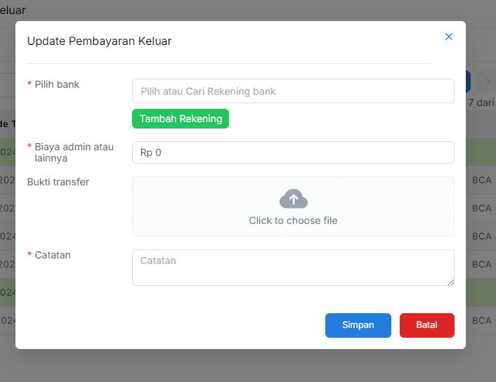 Masuk ke menu **Akuntansi > Keuangan > Pembayaran Keluar.** Di sini akan muncul daftar transaksi yang sedang diproses. Admin harus memilih transaksi yang ingin diselesaikan prosesnya, lalu akan muncul popup untuk pembayaran keluar.
